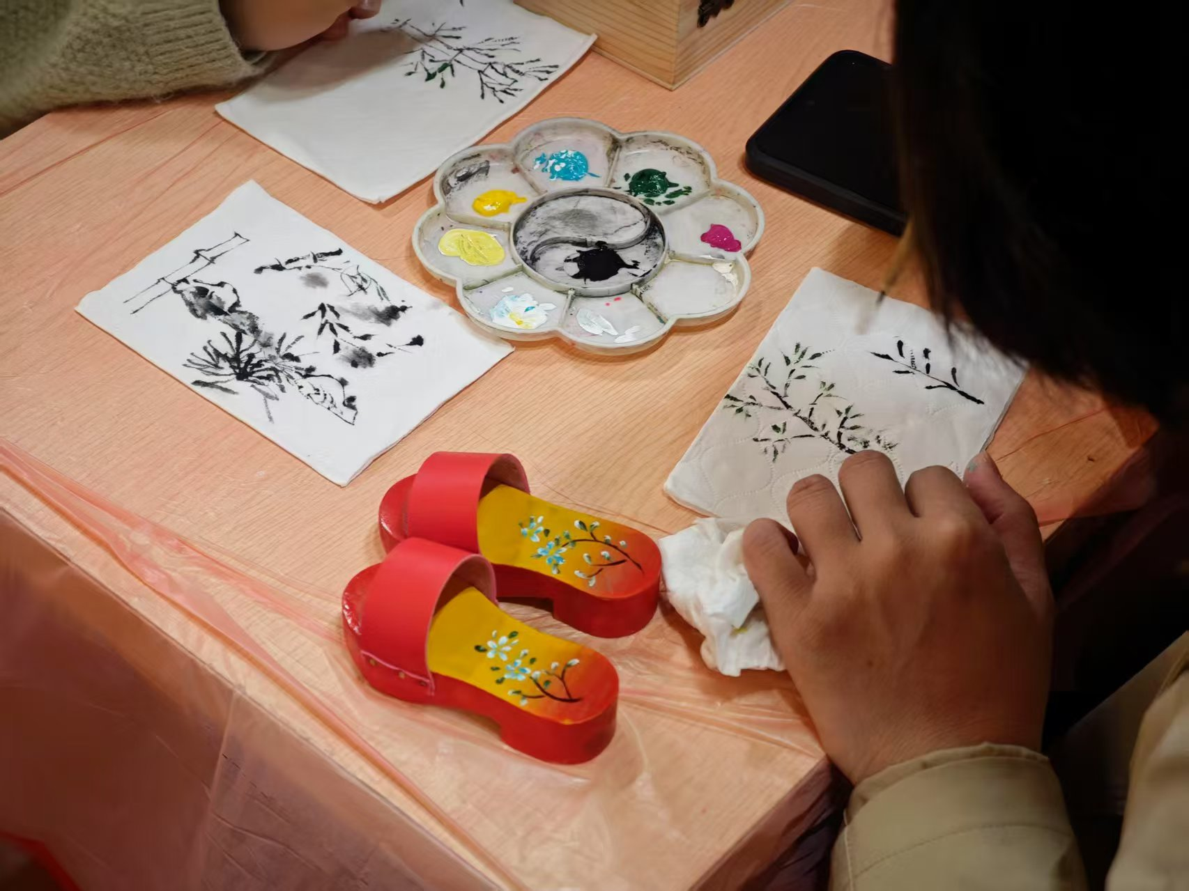 康帝国际酒店的“守艺时光”非遗活动以“五项非遗、五场体验”的丰富内涵,勾勒出莞邑文化的传承脉络。藤编体验中,参与者将柔韧藤材塑造成雅致茶托与花器;百岁牌制作专场里,平绣、垫绣技法承载着平安长寿的祈愿;莞草编织唤醒了东莞水乡的在地记忆,寻常水草经巧手编织化作精致器物,织就对一方水土的深情回望。花灯制作与红漆描花木屐制作体验更是将传统工艺与当代审美结合,在素木屐上勾勒传统纹样让古代漆艺重焕新生。