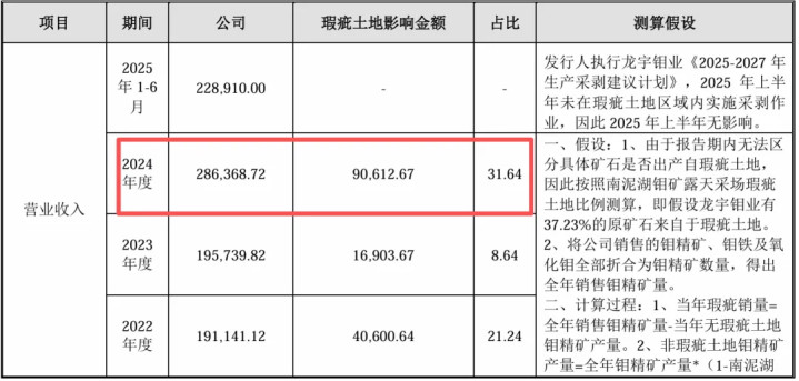 尤为关键的是,公司主要通过全资子公司龙宇钼业南泥湖钼矿进行矿山开采,虽然南泥湖采场瑕疵土地区域主要为未来三年内暂不实施采剥作业的区域,但其瑕疵土地将影响公司营收与利润。以2024年为例,据盛龙股份测算,南泥湖采场上述瑕疵土地将影响公司营业收入约9.06亿元、净利润约1.93亿元,分别占公司营收总额的31.64%、净利润的25.58%。